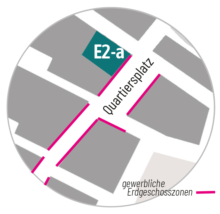 Die nördliche Teilfläche des städtischen Teilgebietes E2 wird im Rahmen einer Konzeptausschreibung im Erbbaurecht vergeben. Gewünscht ist die Bebauung mit einem privat betriebenen Nachbarschaftszentrum „Gesund Wohnen“ mit quartiersbelebenden Wohn- und Gewerbeflächen. Die Nähe zu Grünachsen, dem zentralen Quartiersplatz und der ÖPNV-Anbindung ermöglicht eine starke Einbindung des Hauses in die Quartiersstruktur.